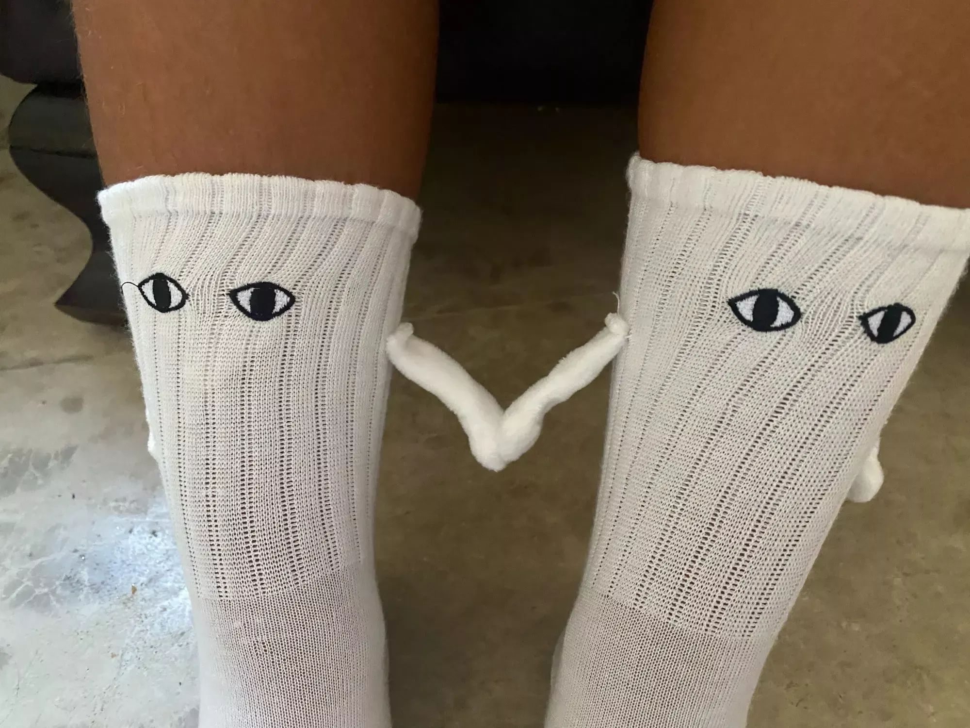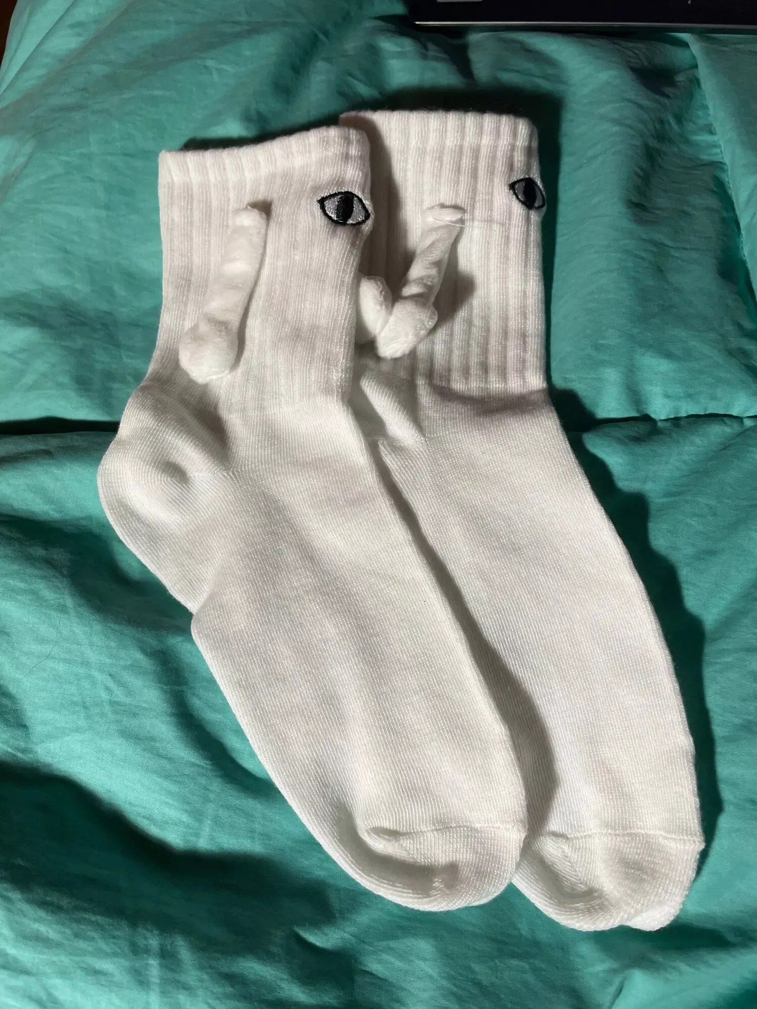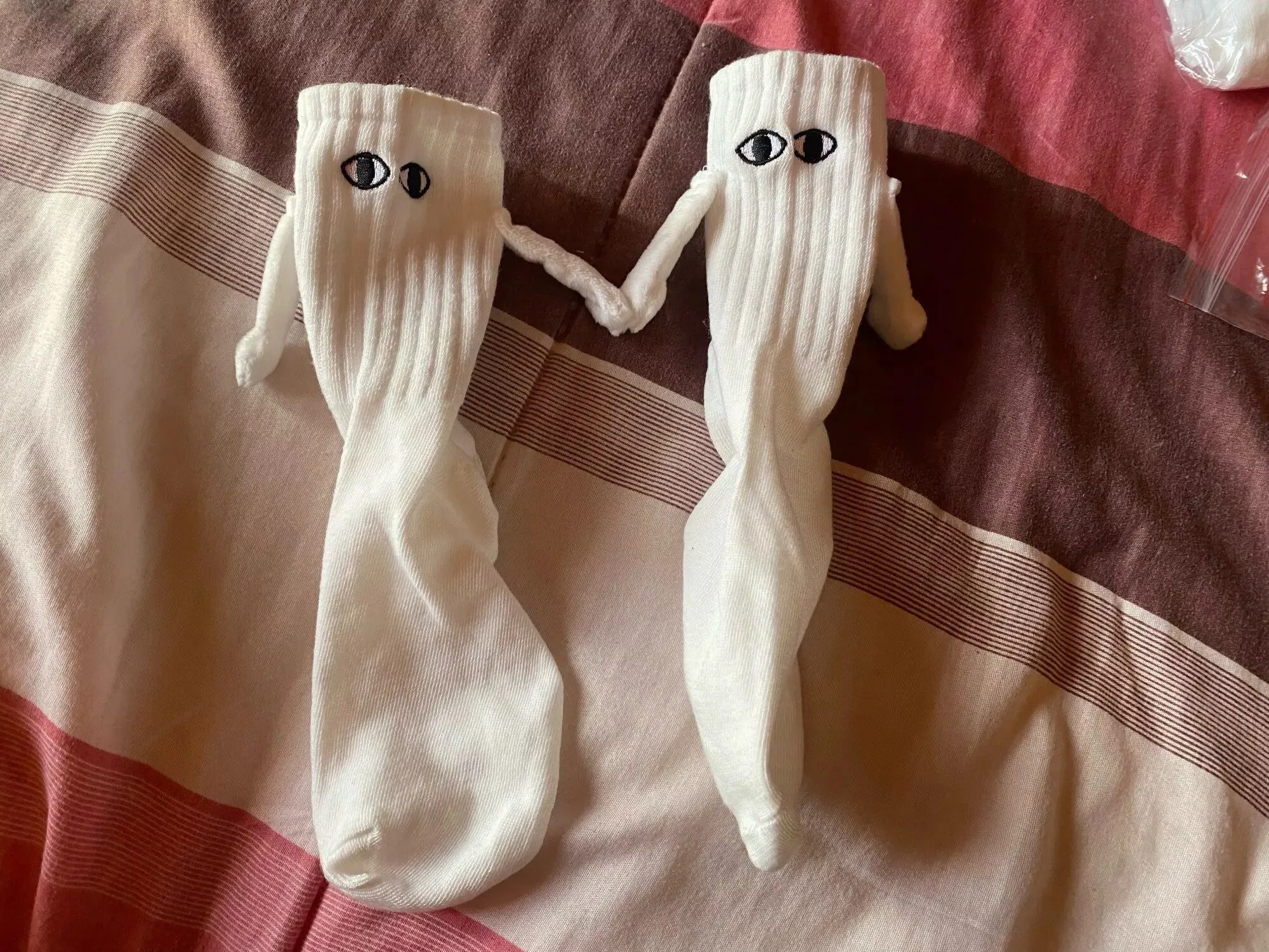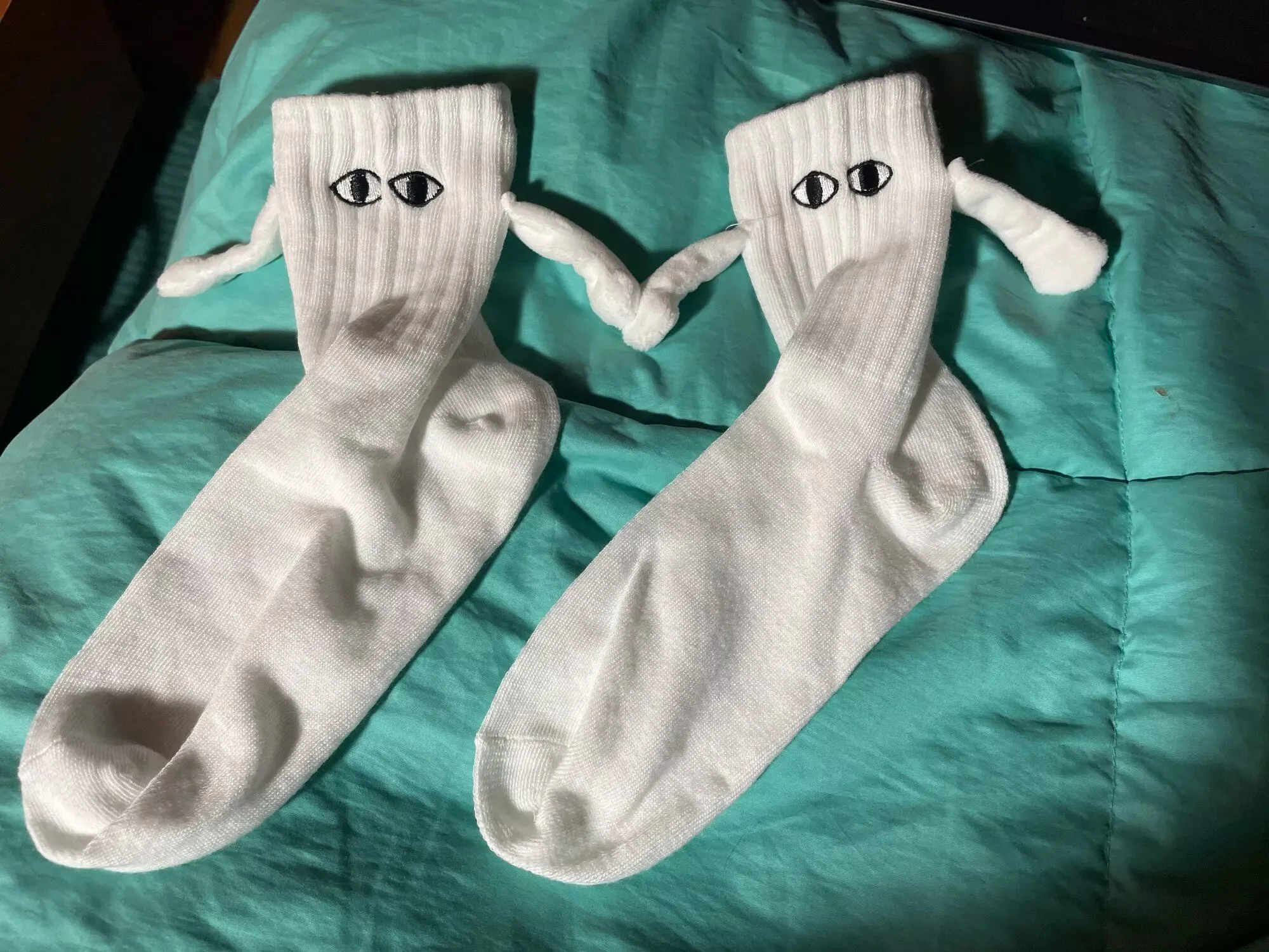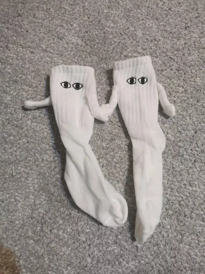 Although they run a bit small, these socks are undeniably cute. I enjoyed the playful eyeball designs and the adorable hand-holding feature. They made for a fun addition to our holiday stockings, providing entertainment as we tried to make them hold hands.