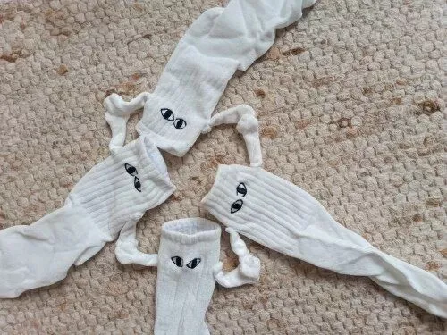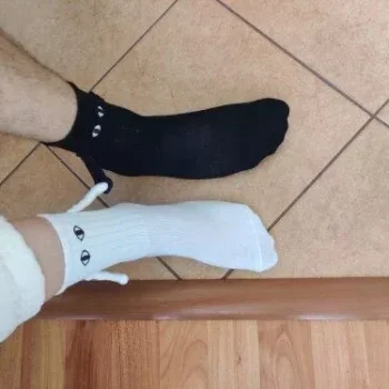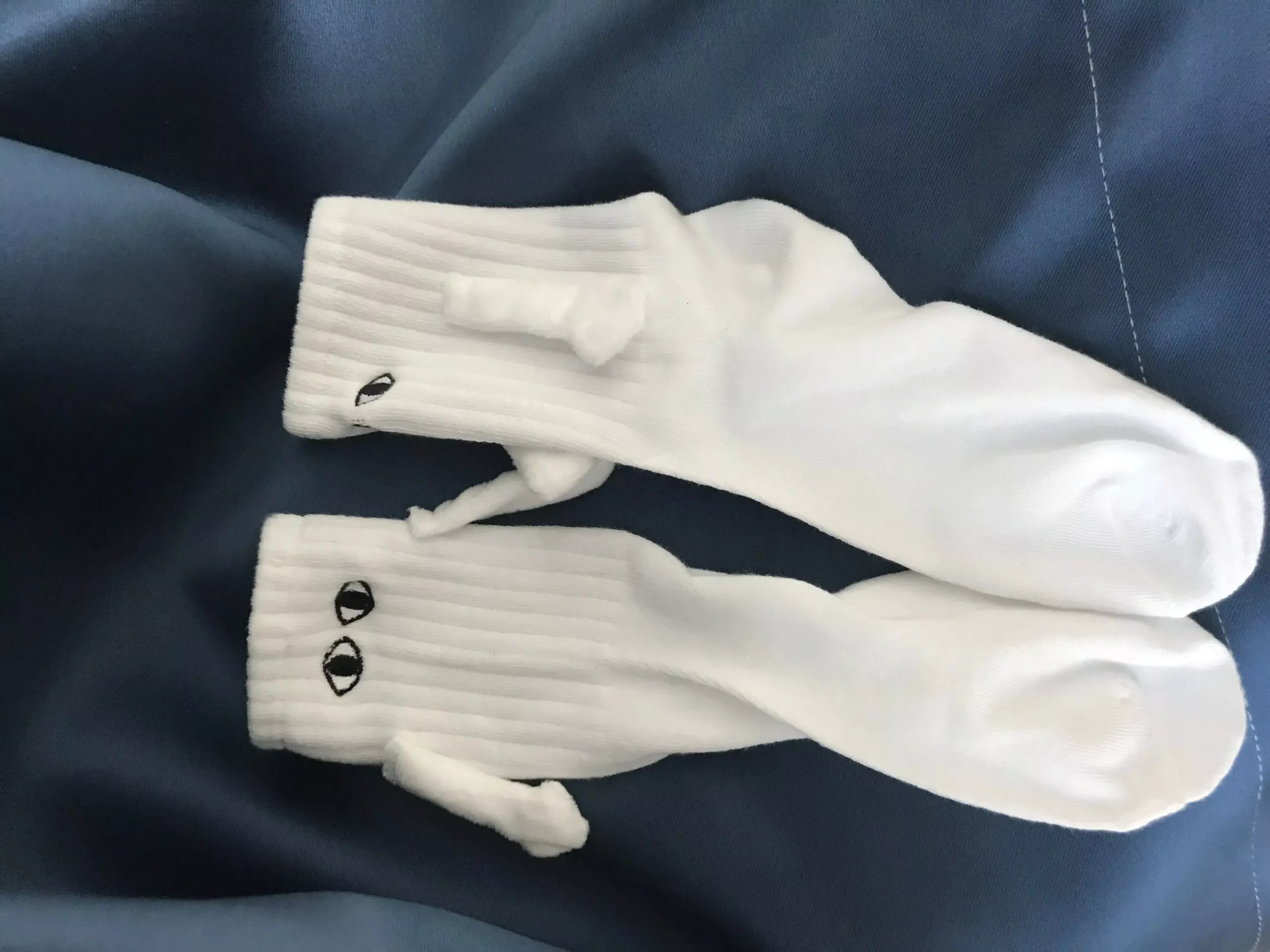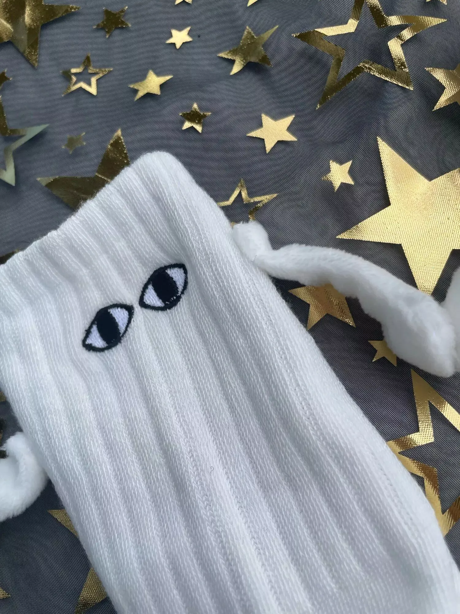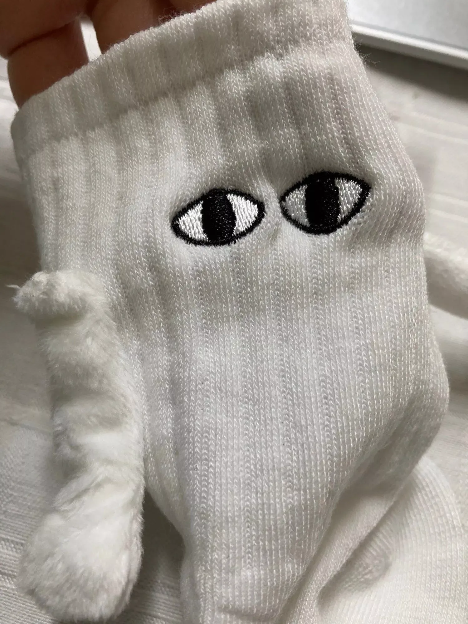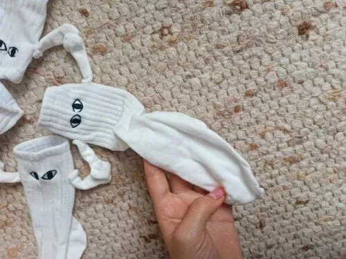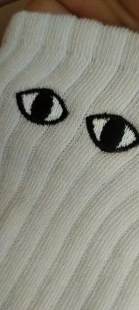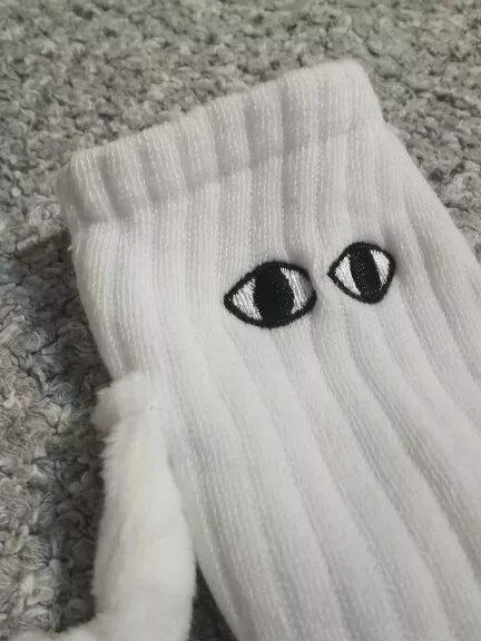 These socks are absolutely adorable—I ordered both the black and white pairs. Each one has slightly different eye designs, adding to their charm. The flexibility to attach their hands to either color is a fantastic feature, making them perfect stocking stuffers!