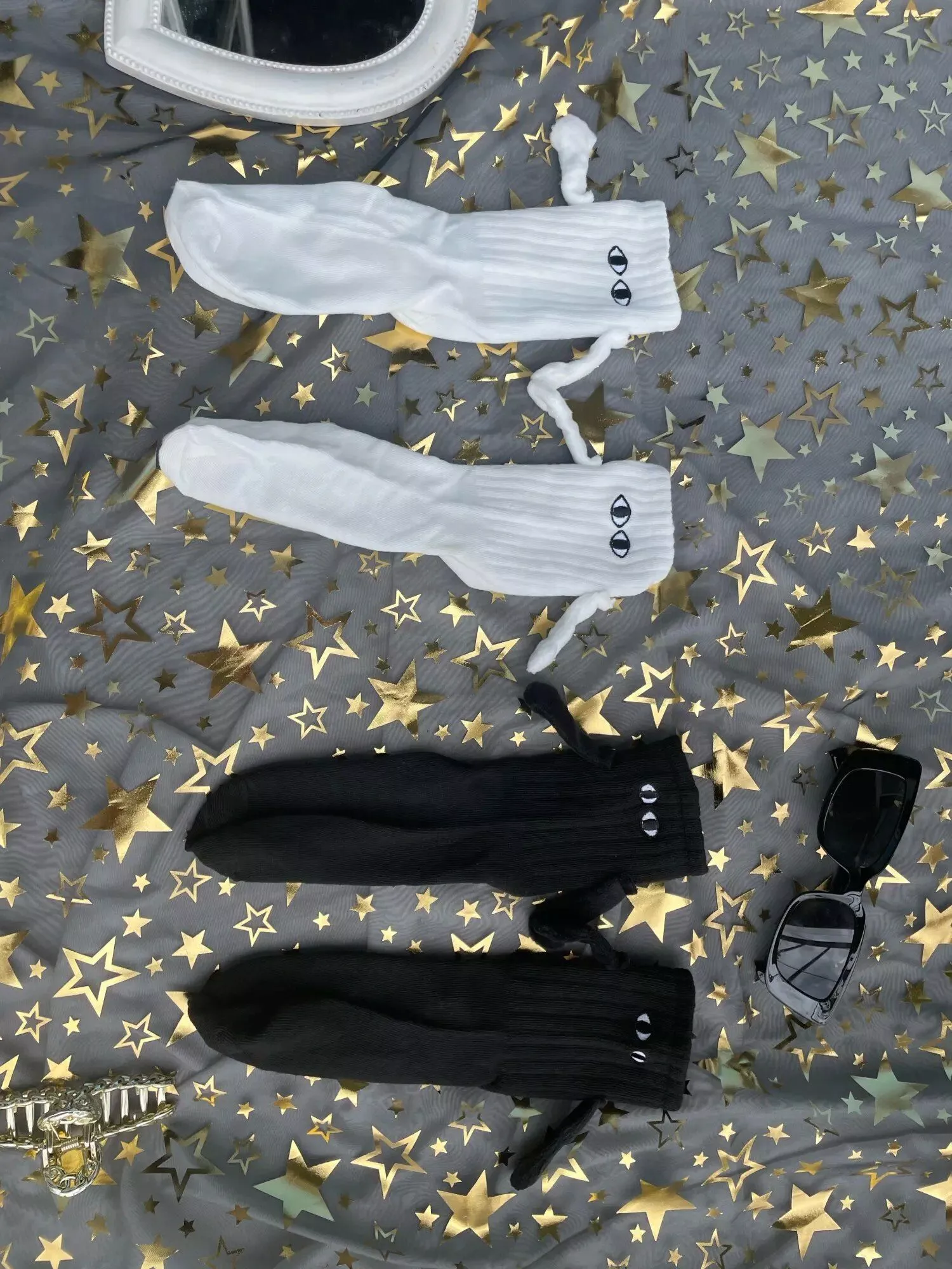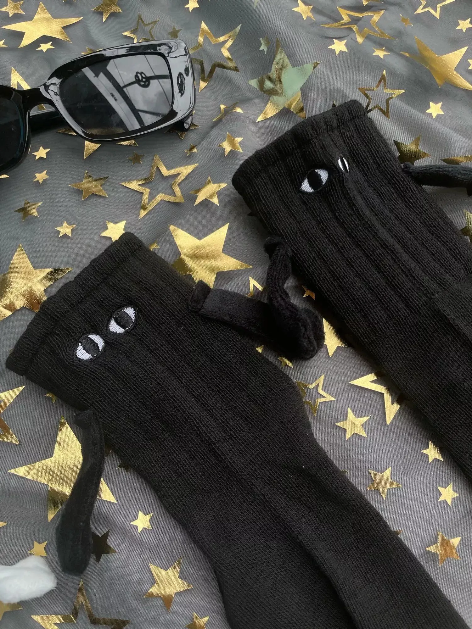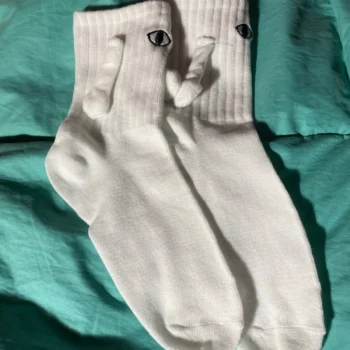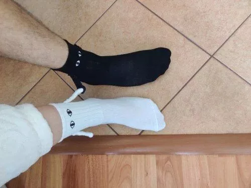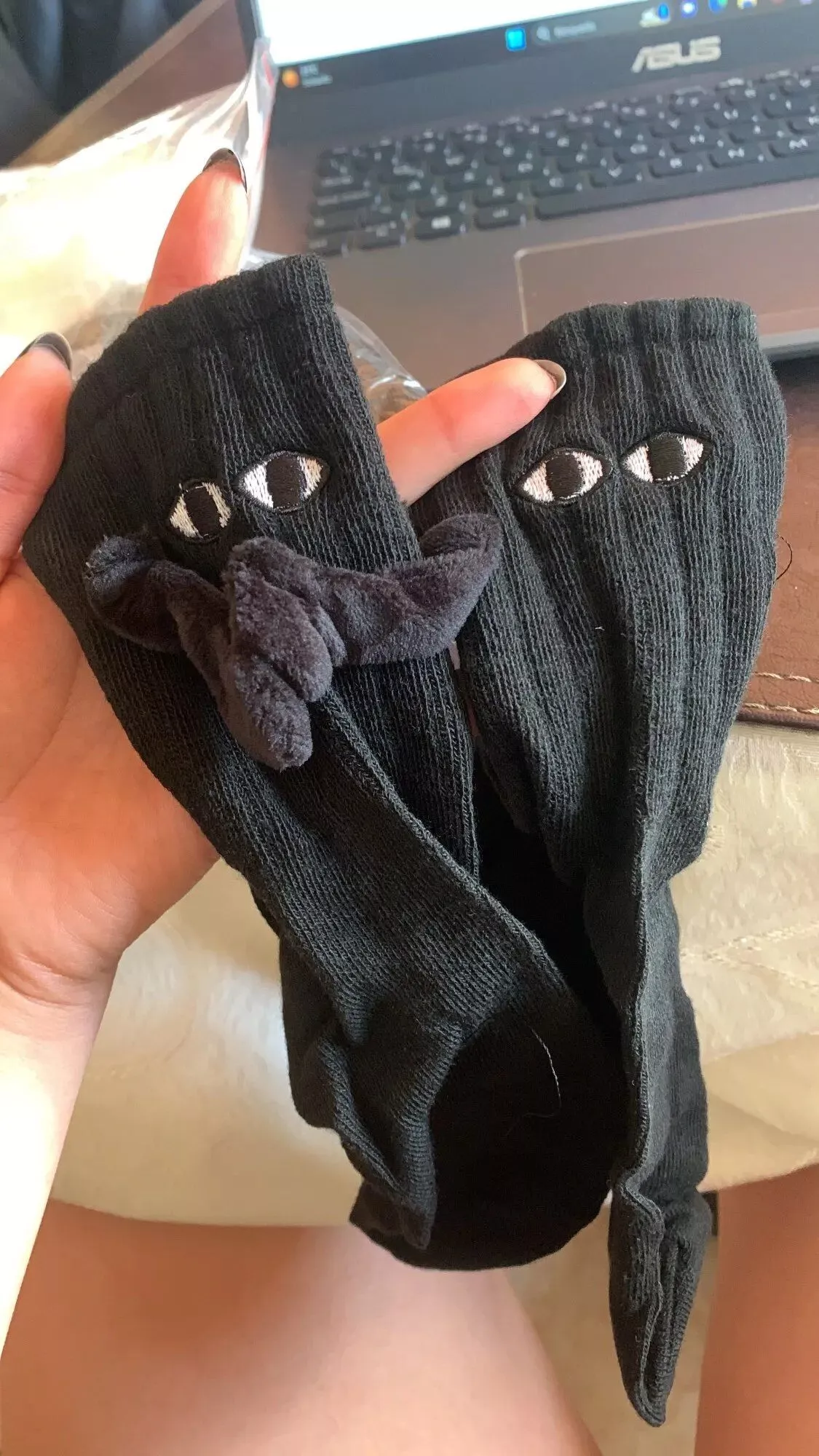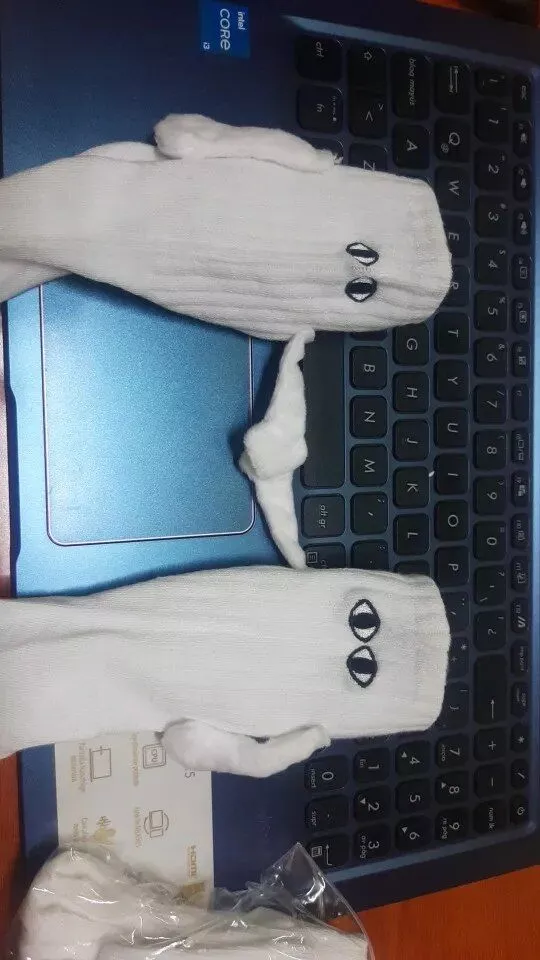 These socks are absolutely adorable—I ordered both the black and white pairs. Each one has slightly different eye designs, adding to their charm. The flexibility to attach their hands to either color is a fantastic feature, making them perfect stocking stuffers!